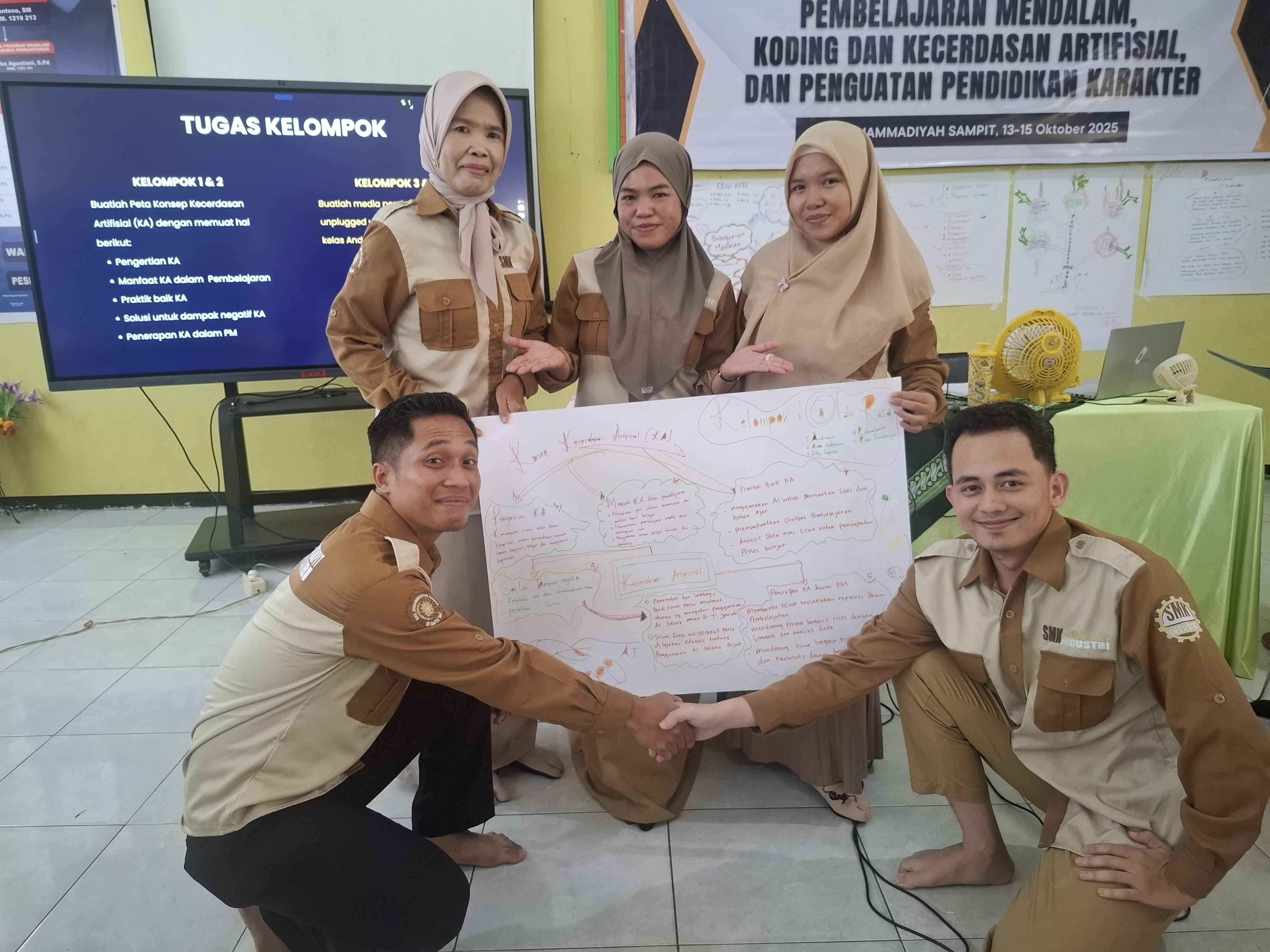 Sampit, 14 Oktober 2025 — Suasana semangat belajar tampak memenuhi ruang pelatihan guru SMK Muhammadiyah Sampit pada hari kedua kegiatan In House Training (IHT) bertema “Pembelajaran Mendalam, Koding, Kecerdasan Artifisial, dan Penguatan Pendidikan Karakter.” Selama tiga hari pelaksanaan, kegiatan ini menjadi momentum penting bagi para pendidik untuk memperkuat kompetensi abad ke-21, sekaligus memperdalam pemahaman terhadap teknologi kecerdasan artifisial (AI) dalam dunia pendidikan.